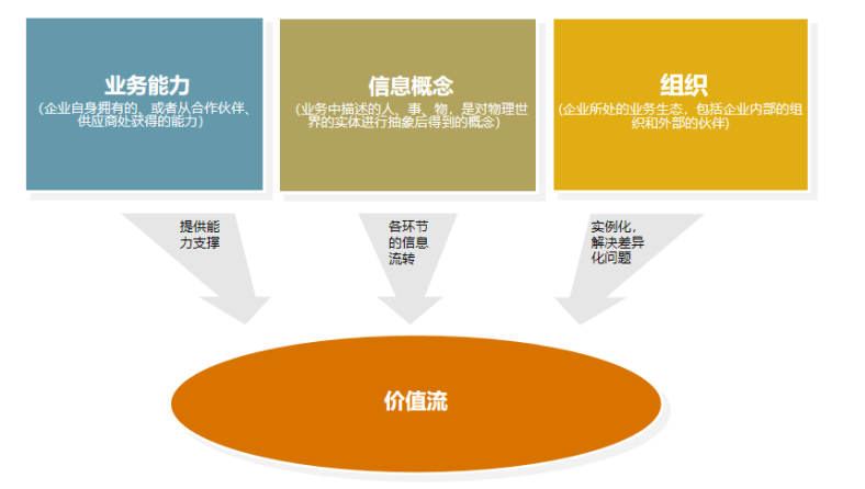 价值流与业务能力、信息概念和组织的关系 价值流在业务架构充当了“骨架”的角色,为其他架构要素(业务能力、信息概念、组织)提供设计锚点: