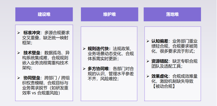 一、合规管理的挑战 在监管趋严与企业数字化转型的双重驱动下,合规管理已从 “成本中心” 转变为 “战略刚需”。根据国资委第 42 号令,合规管理需覆盖全业务流程,实现 “不敢违规、不能违规、不想违规” 的长效机制。然而,当前企业普遍面临三大痛点: