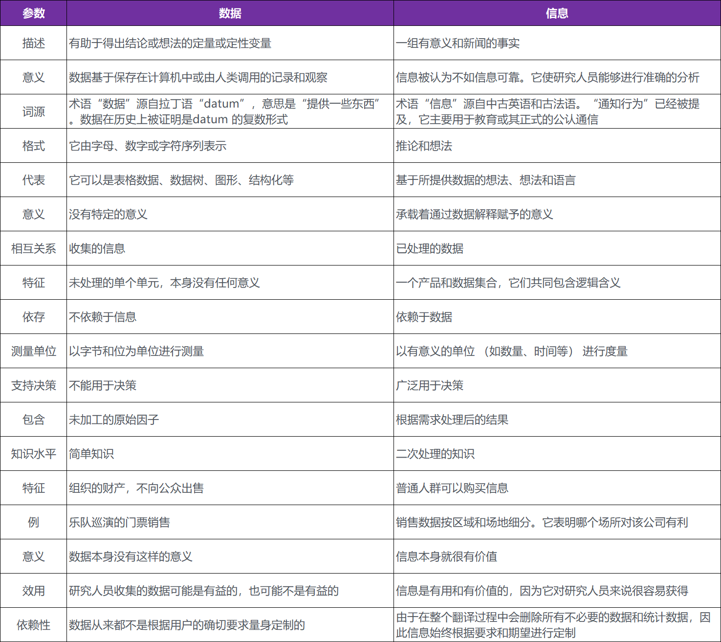结论 总而言之,数据是基本事实的非结构化集合,可以从中检索信息。 机器生成的数据、实时数据、关系数据库、从 Web 获取信息的数据挖掘工具、人为生成的数据、IoT(物联网)设备和其他几个来源用于获取数据。从大量可用数据中解释、分析和组织最相关和最值得信赖的信息可能非常耗时。组织必须努力建立一个流程,利用技术来保证数据值得信赖和高质量,并且只收集有助于业务发展的重要信息。 常见问题解答 1. 数据和信息之间的 5 个主要区别: